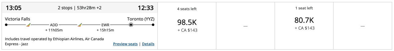 I once booked a wild route from Victoria Falls (VFA) → Addis Ababa (ADD) → Lomé (LFW) → New York (EWR) → Toronto (YYZ) — all in business class for just 80,000 Aeroplan points thanks to a dynamic pricing quirk. 👇