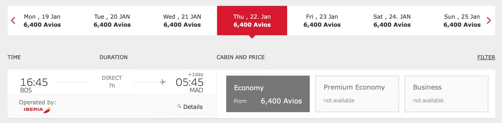 For example, here’s a fare from Boston to Madrid for 6,400 Avios (and about $90 in fees). Availability is wide open right now.
