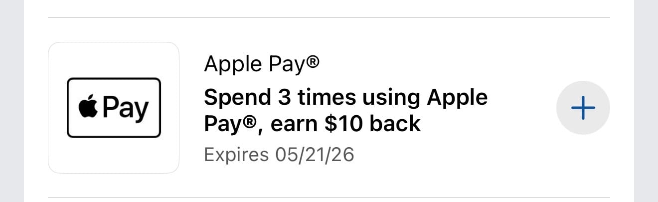 The last one is probably the easiest win. I found this offer on my Hilton co-branded card: earn $10 back after using the card for three Apple Pay purchases.