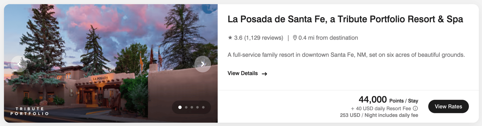 If you want something with spa energy and a little indulgence, Marriottâs La Posada de Santa Fe looks pretty quintessential Santa Fe, and can be booked for 44,000 Marriott Bonvoy points per night: