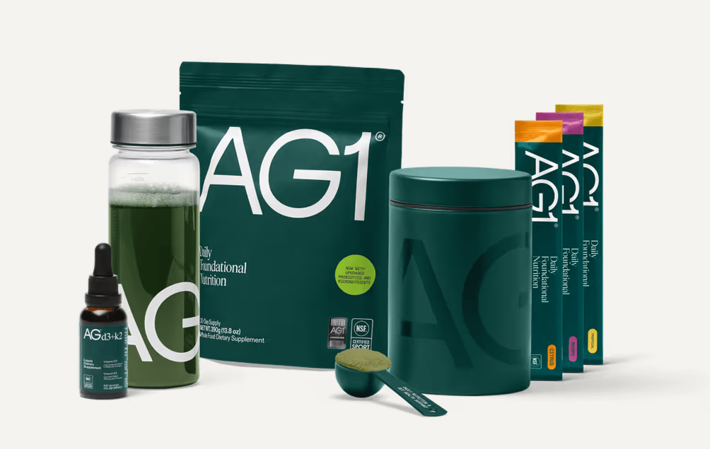 AG1 is basically my one-stop-shop daily health drink â a multivitamin, probiotics, and a bunch of whole-food-sourced ingredients, all in one scoop. I mix it with cold water first thing in the morning, and Iâm done.