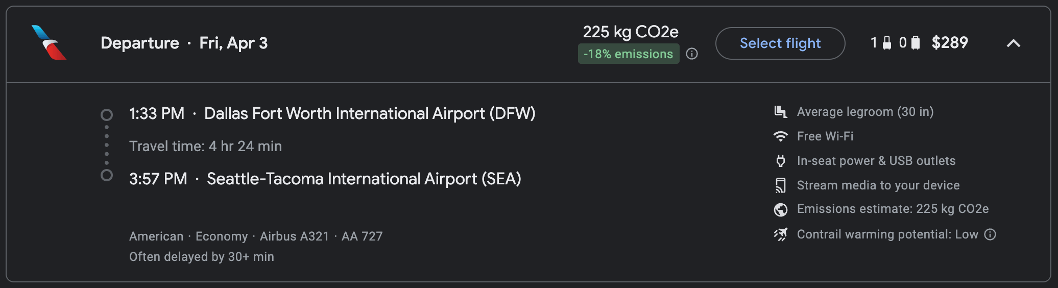 Letâs use a more modest example of a flight from Dallas to Seattle on AA, which costs $289. đ